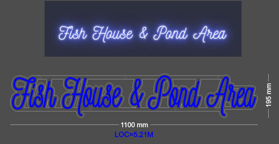 Text: Fish House & Pond Area Text Align: leftFont: NickainleyColour: BlueSize: 1100mm x 195mmBackboard: Cut to letterBackboard Colour: Clear Acrylic BackboardJacket: Coloured JacketMounting: Wall mounting screwsRemote Dimmer: YesPower Mode: Power Adaptor
