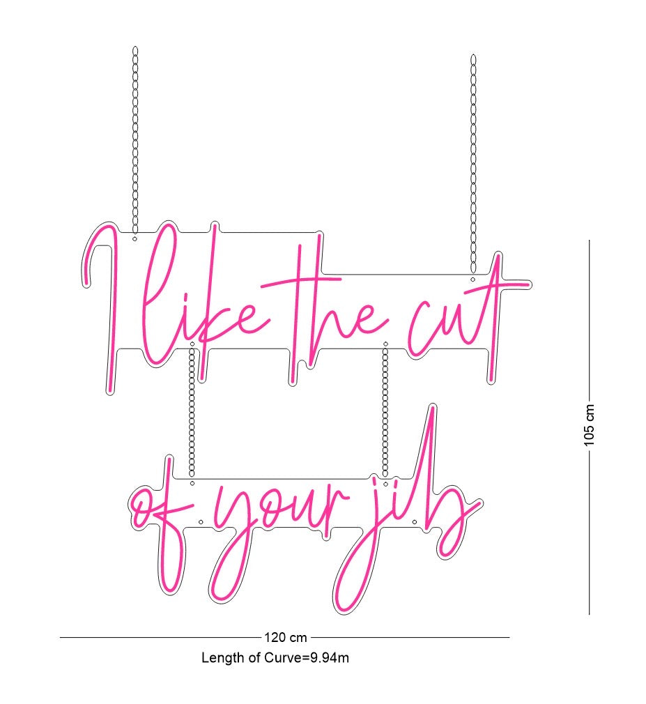 Original LogoText: I like the cut of your jib Text Align: CenterFont: OttawaColor: PinkSize: 120cm wide / 120cm X 105.47cm / 47.24in X 41.52inMaterial: Outdoor (+30%) Backboard: Cut to ShapeBackboard Color: Clear Acrylic BackboardJacket: Coloured JacketMounting: HangingAdd a Heart or Star ...