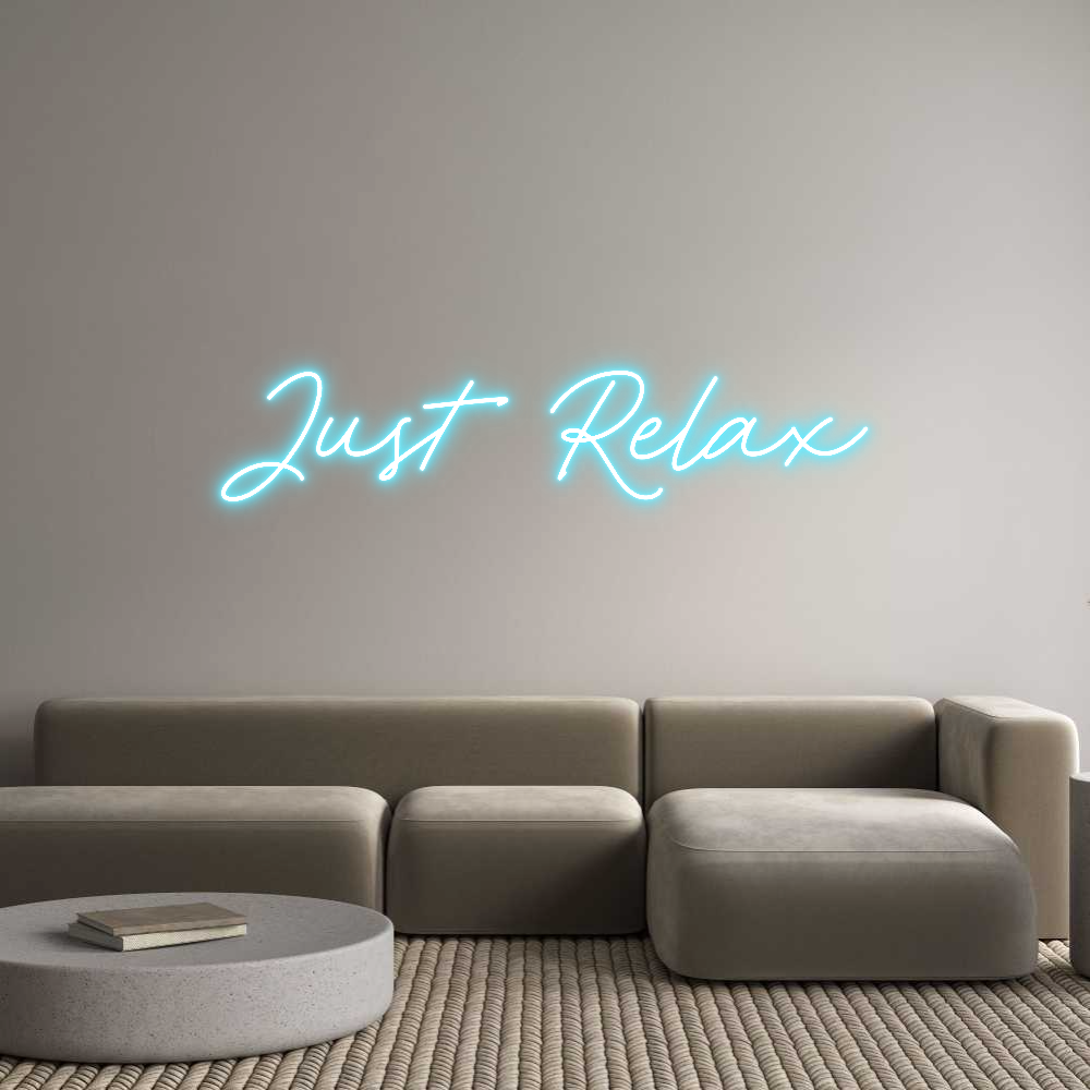 Text: Just Relax Text Align: LeftFont: RocketColor: Ice BlueSize: 80cm wide / 80cm X 17.17cm / 31.5in X 6.76inBackboard: Cut to ShapeBackboard Color: Clear Acrylic BackboardJacket: Coloured JacketMounting: Wall mounting screwsAdd a Heart or Star (Optional): None (Default)Neon Tube Th...