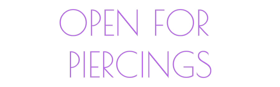 Text: OPEN FOR PIERCINGS Text Align: centerFont: PoiretColour: PurpleSize: 120cm wide / 120cm X 53.57cm / 47.24in X 21.09inBackboard: Whole Board (free upgrade)Backboard Colour: BlackJacket: Coloured JacketMounting: HangingAdd a Heart or Star (Optional): None (Default)Neon Tube Thi...