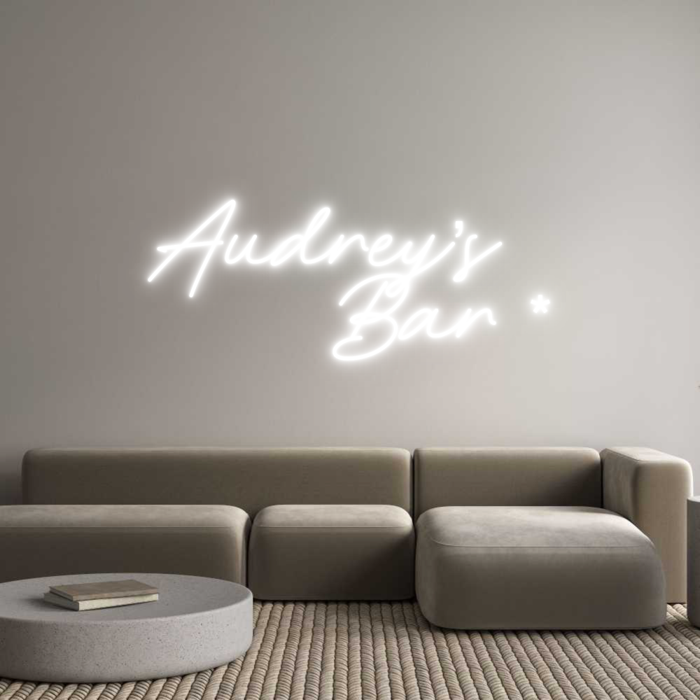 Text: Audrey’s Bar * Text Align: leftFont: RocketColour: Colour Changing Neon sign/ RGB +85% price increase. Lights can be controlled through remoteSize: 100cm wide / 100cm X 50.95cm / 39.37in X 20.06inBackboard: Cut to Letter (free upgrade)Jacket: Coloured JacketMounting: Wal...