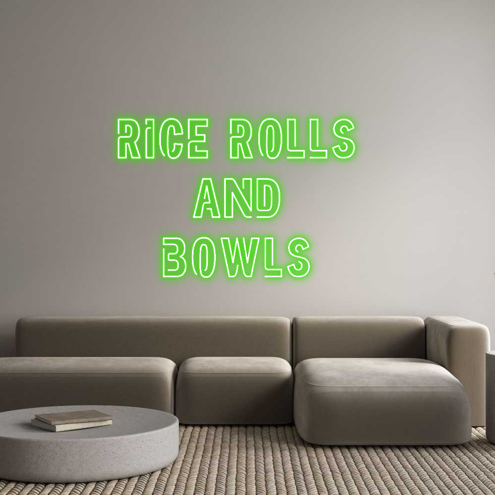 Text: Rice rolls and Bowls Text Align: centerFont: NeonColour: GreenSize: 80cm wide / 80cm X 50.46cm / 31.5in X 19.87inBackboard: Whole Board (free upgrade)Backboard Colour: BlackJacket: Coloured JacketMounting: HangingAdd a Heart or Star (Optional): None (Default)Neon Tube Thic...