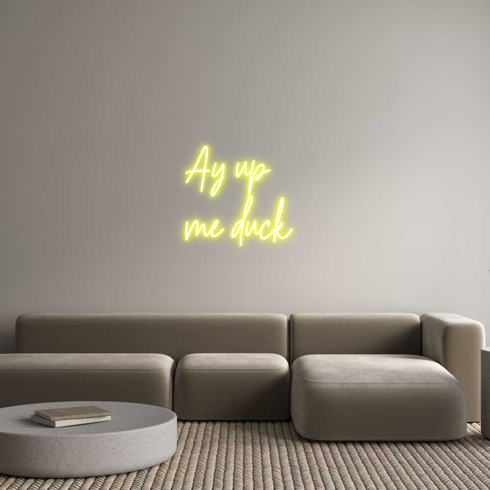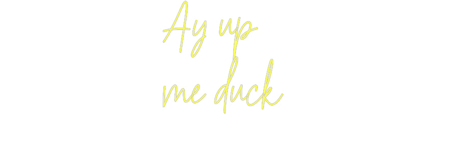 Text: Ay up me duck Text Align: leftFont: HestericaColour: YellowSize: 40cm wide / 40cm X 38.1cm / 15.75in X 15inBackboard: Cut to ShapeBackboard Colour: Clear Acrylic BackboardJacket: Coloured JacketMounting: Wall mounting screwsAdd a Heart or Star (Optional): None (Default)Neon T...
