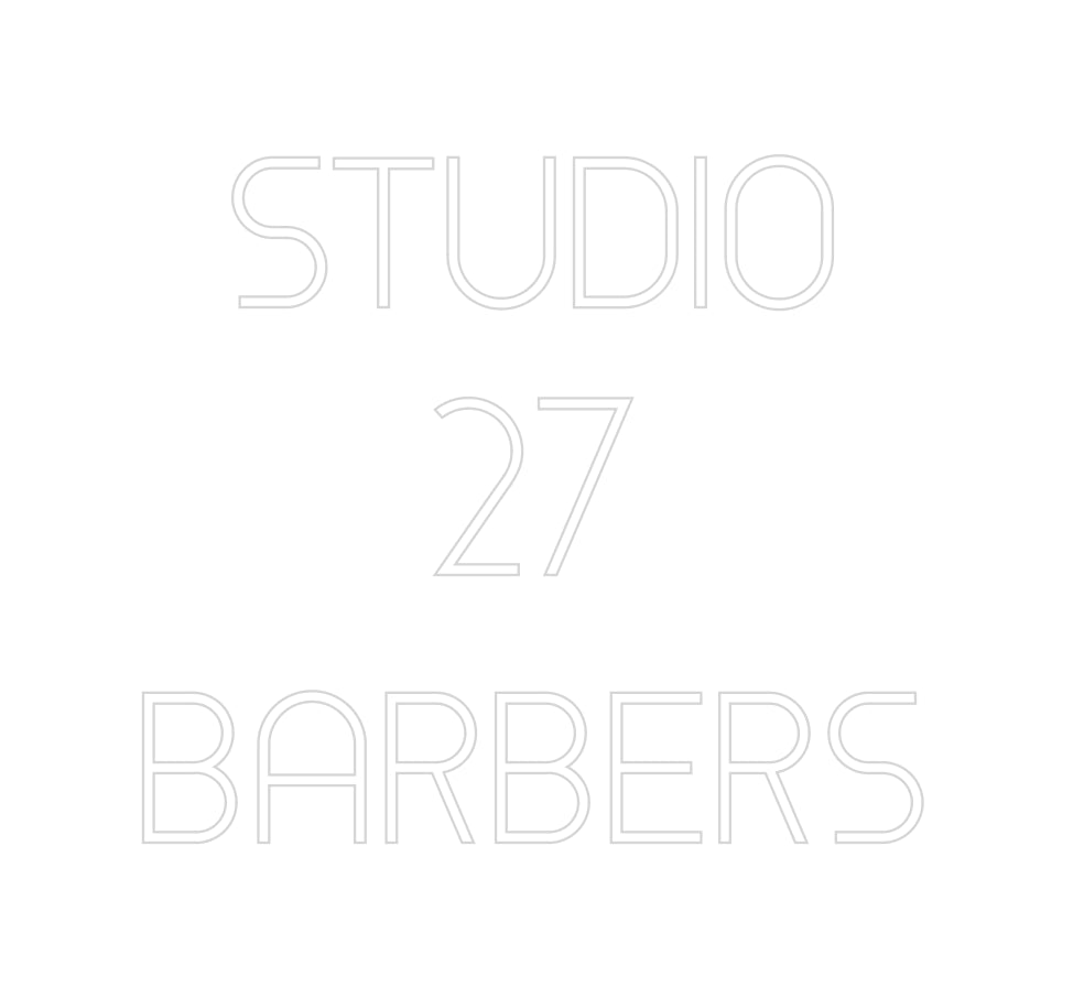 Text: STUDIO 27 BARBERS Text Align: center Font: TimeColour: WhiteSize: 60cm wide / 60cm X 51.63cm / 23.62in X 20.33inBackboard: Cut to ShapeBackboard Colour: Clear Acrylic BackboardJacket: White JacketMounting: HangingAdd a Heart or Star (Optional): None (Default)Neon T...