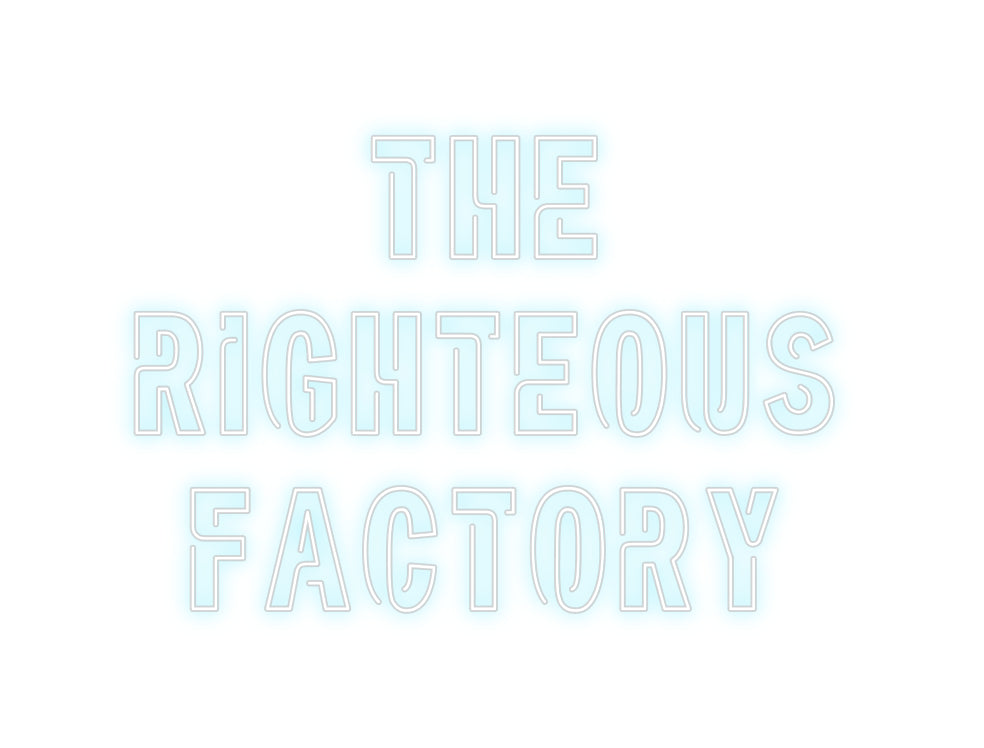 Text: THE RIGHTEOUS FACTORY Text Align: center Font: NeonColour: Ice BlueSize: 80cm wide / 80cm X 56.01cm / 31.5in X 22.05inBackboard: Cut to Letter (free upgrade)Jacket: Coloured JacketMounting: HangingAdd a Heart or Star (Optional): None (Default)Neon Tube Thickness: Bold...