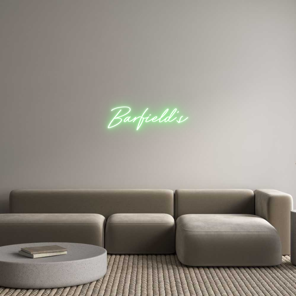 Text: Barfield's Text Align: leftFont: BayshoreColour: Light GreenSize: 80cm wide / 80cm X 23.52cm / 31.5in X 9.26inBackboard: Cut to ShapeBackboard Colour: Clear Acrylic BackboardJacket: White JacketMounting: Wall mounting screwsAdd a Heart or Star (Optional): None (Default)Neon Tub...