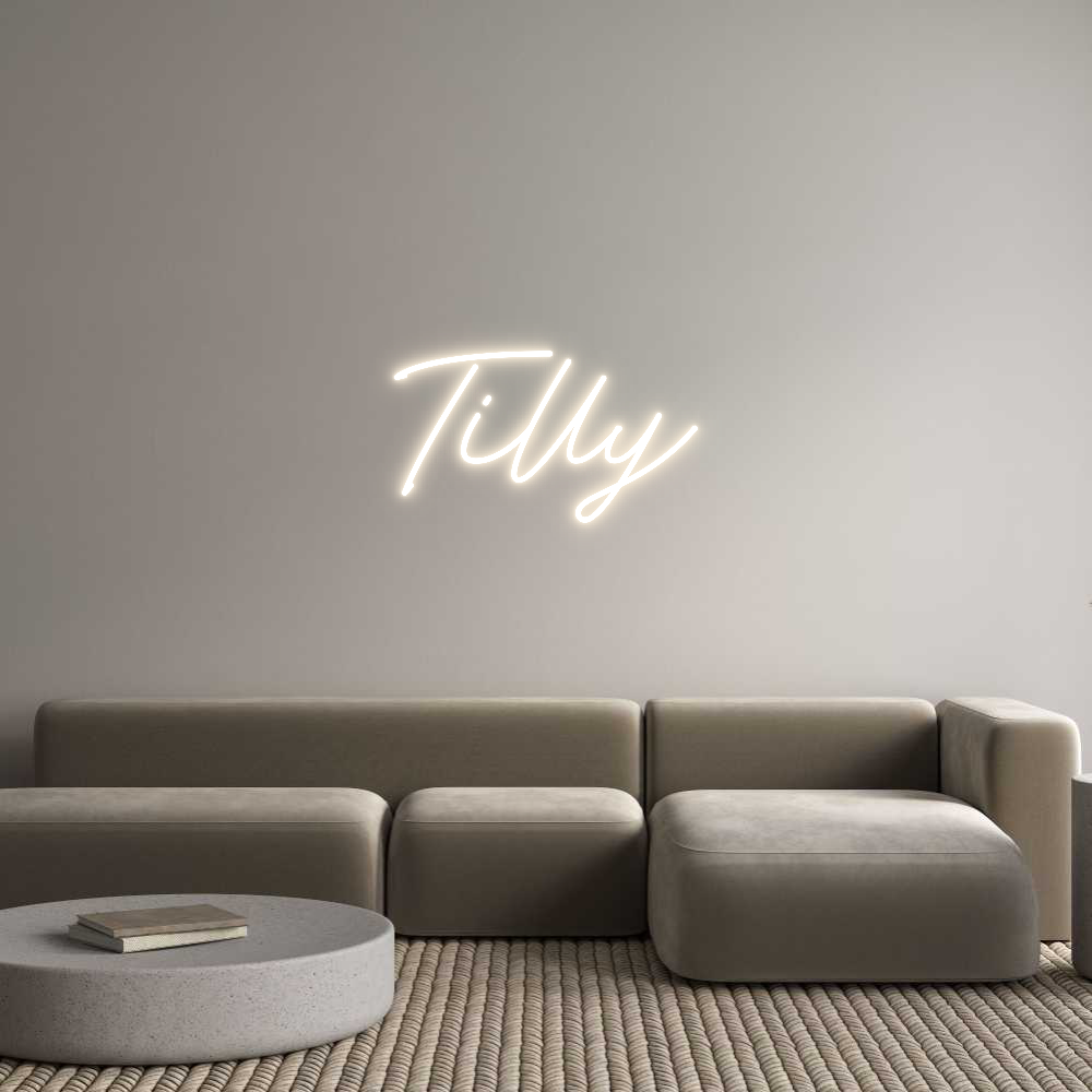 Text: Tilly Text Align: leftFont: RocketColour: Warm WhiteSize: 60cm wide / 60cm X 34.6cm / 23.62in X 13.62inBackboard: Cut to Letter (free upgrade)Jacket: Coloured JacketMounting: Wall mounting screwsAdd a Heart or Star (Optional): None (Default)Neon Tube Thickness: Bold Tube (8mm) ...