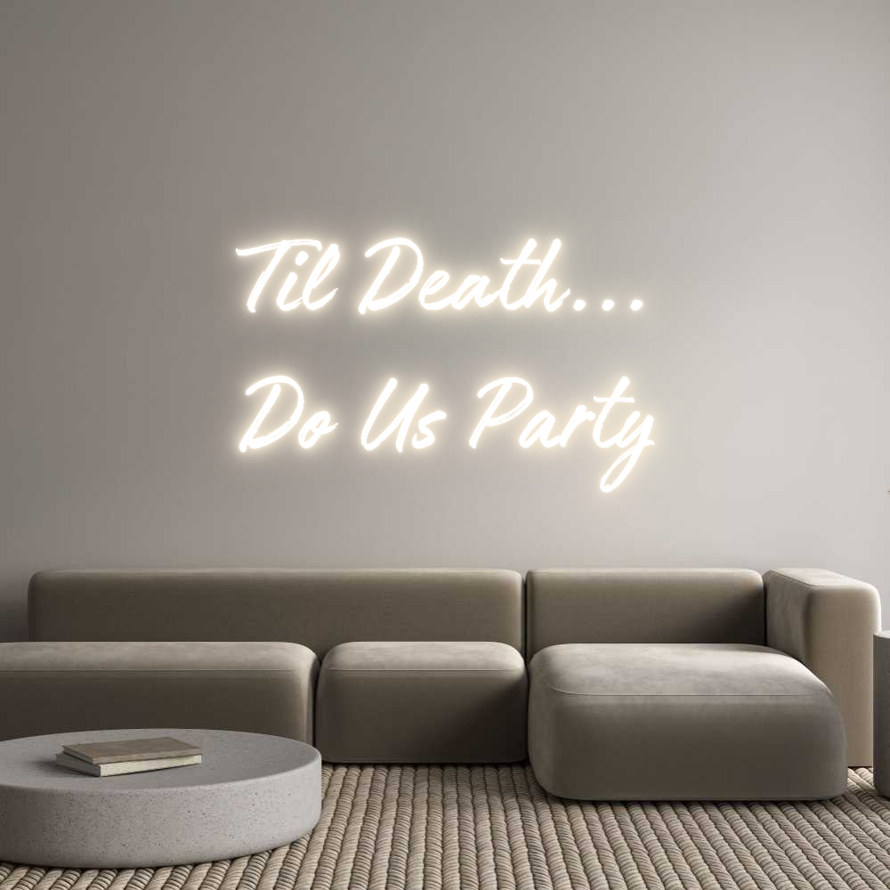 Text: Til Death... Do Us Party Text Align: LeftFont: WorldColor: Warm WhiteSize: 80cm wide / 80cm X 49.51cm / 31.5in X 19.49inMaterial: IndoorBackboard: Cut to Letter (free upgrade)Jacket: Coloured JacketMounting: Fast mount kitAdd a Heart or Star (Optional): None (Default)Neon Tube Thick...