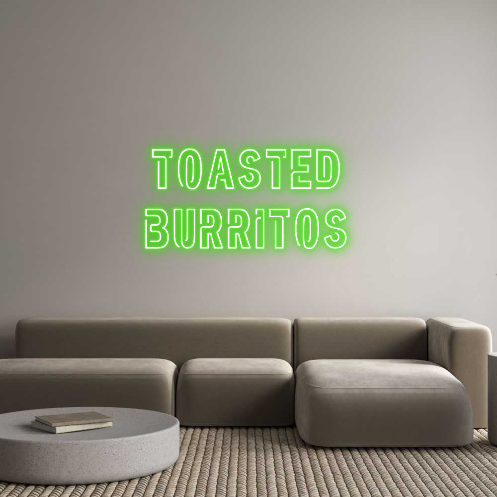 Text: Toasted Burritos Text Align: centerFont: NeonColour: GreenSize: 80cm wide / 80cm X 40.5cm / 31.5in X 15.95inBackboard: Cut to ShapeBackboard Colour: BlackJacket: White JacketMounting: HangingAdd a Heart or Star (Optional): None (Default)Neon Tube Thickness: Bold Tube (8mm) (fr...