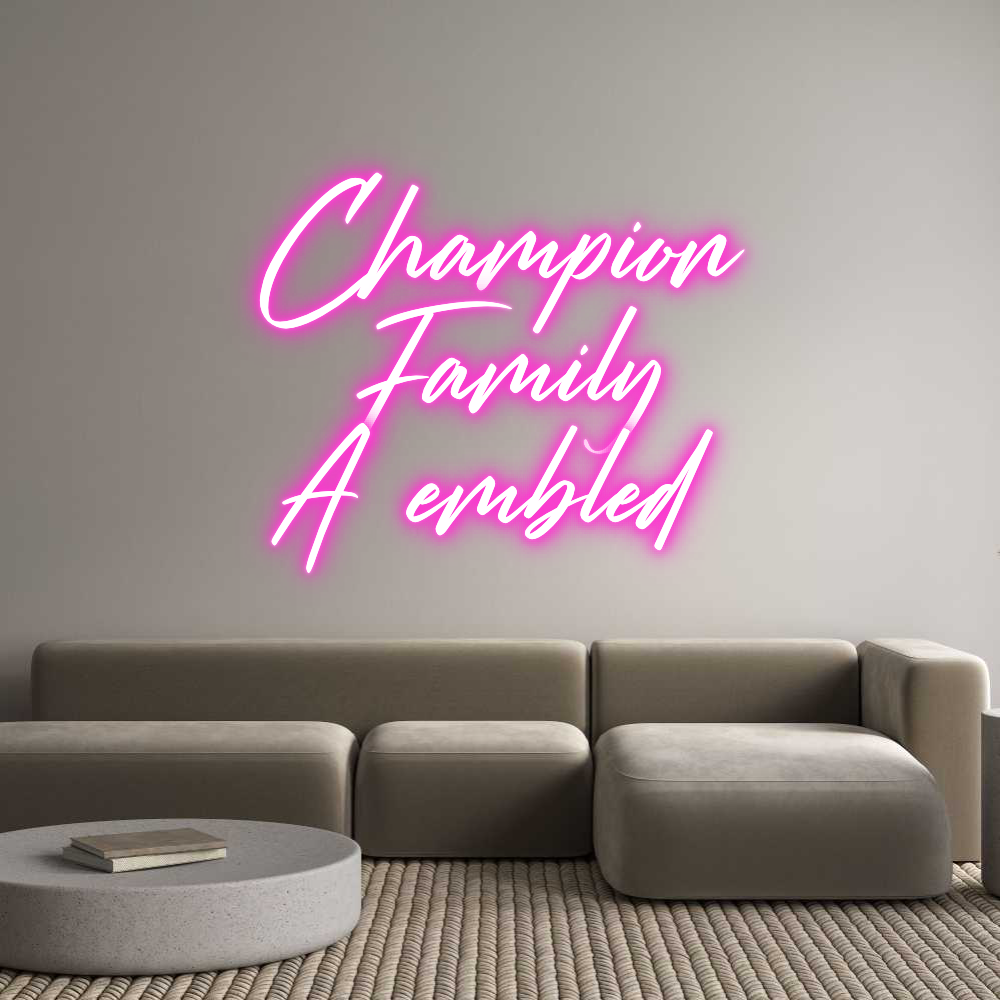 Text: Champion Family Assembled Text Align: CenterFont: StrudeColor: PinkSize: 100cm wide / 100cm X 118.46cm / 39.37in X 46.64inMaterial: IndoorBackboard: Cut to Letter (free upgrade)Jacket: Coloured JacketMounting: Wall mounting screwsAdd a Heart or Star (Optional): None (Default)Neon T...