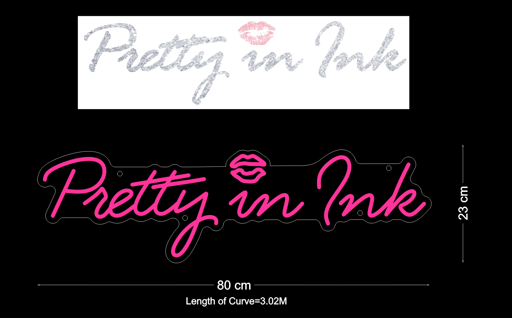 Size: 80cm x 23cm Colour: Pink Backboard shape: Cut to shape Backboard colour: Clear acrylic 2.5m clear cable