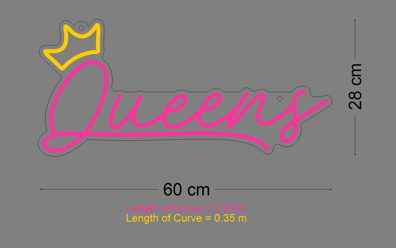 Size: 120cm x 48cmLED colour: Golden yellow and hot pinkBackboard Shape: Cut to ShapeBackboard Colour: Clear acrylicWaterproof: IP67 waterproof + water power supply