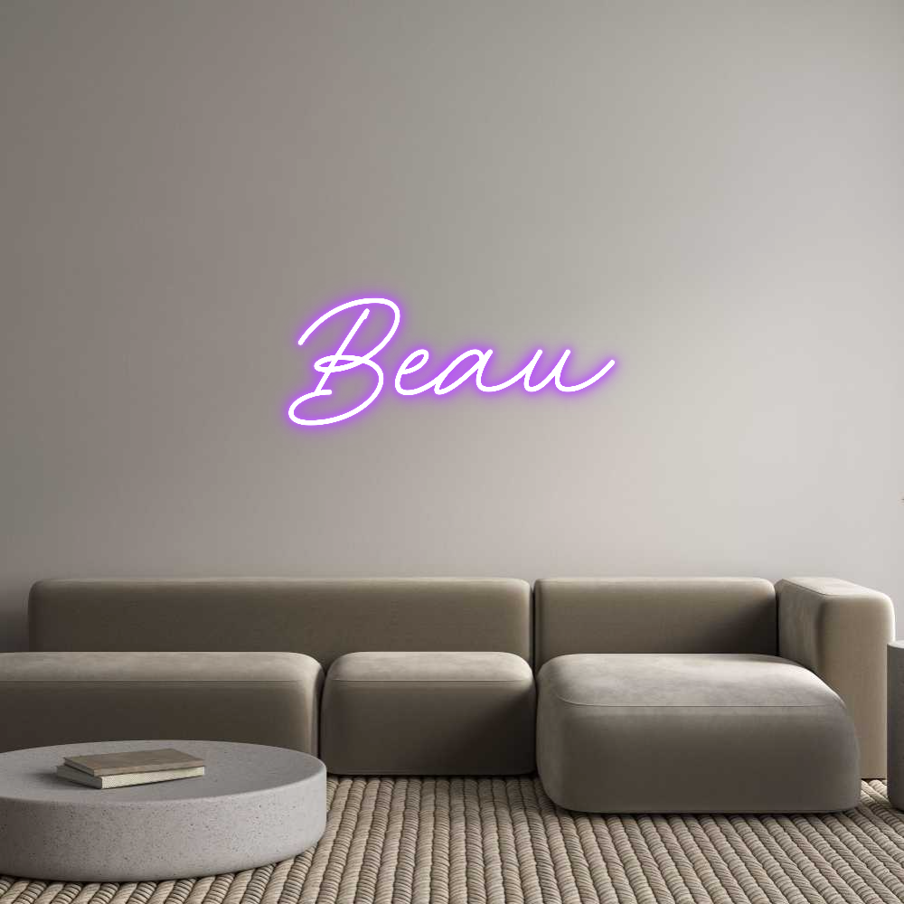 Text: Beau Text Align: leftFont: RocketColour: PurpleSize: 100cm wide / 100cm X 40.13cm / 39.37in X 15.8inBackboard: Cut to Letter (free upgrade)Jacket: Coloured JacketMounting: Wall mounting screwsAdd a Heart or Star (Optional): HeartNeon Tube Thickness: Bold Tube (8mm) (free upgrad...