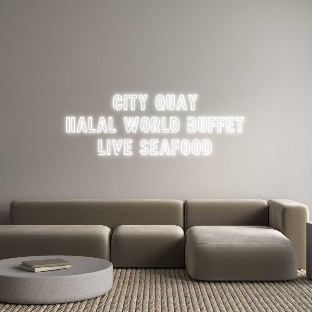 Text: CITY QUAY HALAL WORLD BUFFET LIVE SEAFOOD Text Align: CenterFont: NeonColor: WhiteSize: 120cm wide / 120cm X 41.41cm / 47.24in X 16.3inBackboard: Cut to Letter (free upgrade)Jacket: White JacketMounting: Wall mounting screwsAdd a Heart or Star (Optional): HeartNeon Tube Thick...