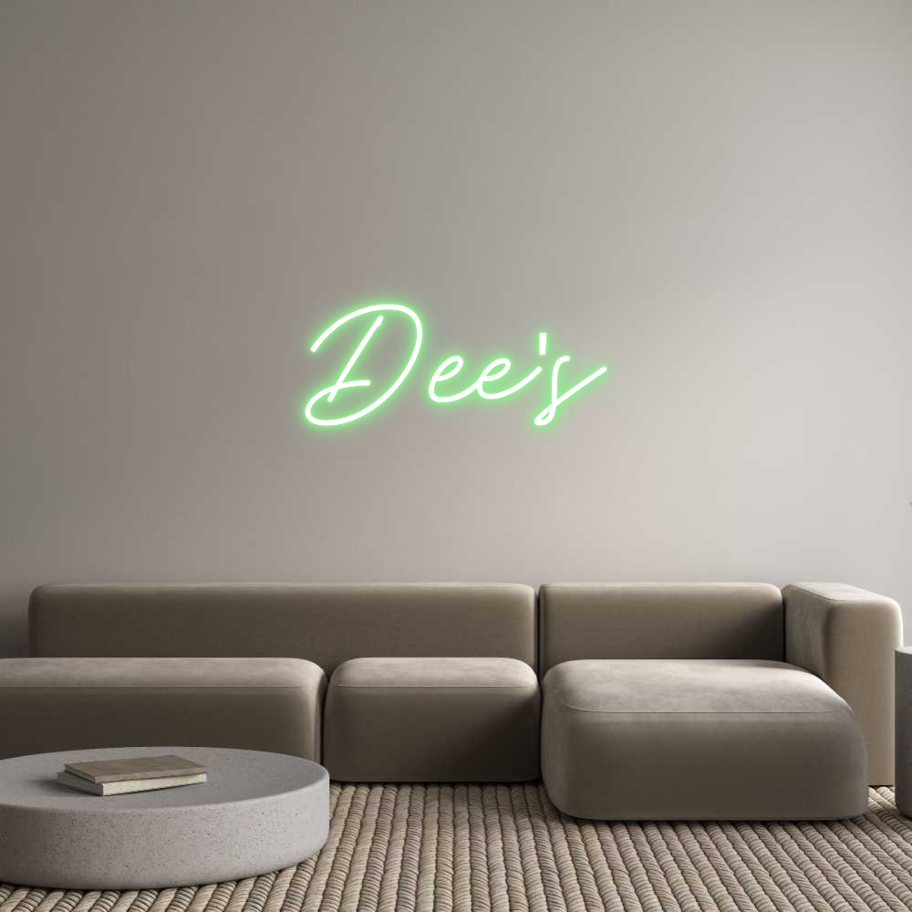 Text: Dee's Text Align: leftFont: RocketColour: Light GreenSize: 60cm wide / 60cm X 23.33cm / 23.62in X 9.19inBackboard: Cut to ShapeBackboard Colour: Clear Acrylic BackboardJacket: White JacketMounting: Wall mounting screwsAdd a Heart or Star (Optional): None (Default)Neon Tube Thic...