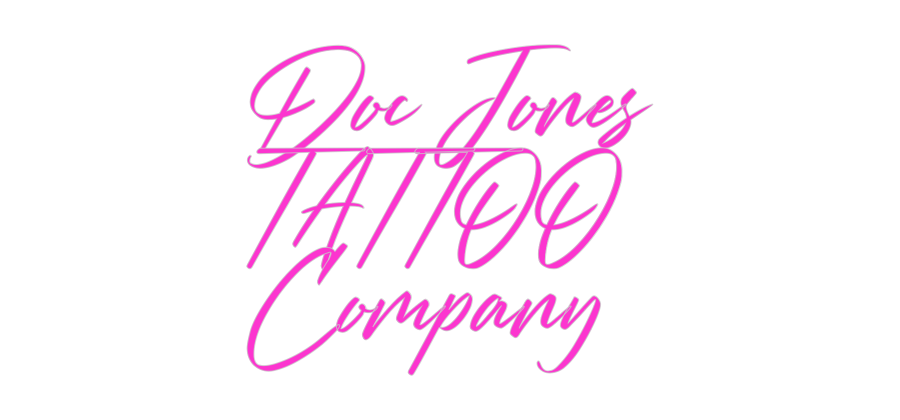 Text: Doc Jones TATTOO Company Text Align: LeftFont: StrudeColor: PinkSize: 60cm wide / 60cm X 70.34cm / 23.62in X 27.69inMaterial: IndoorBackboard: Cut to ShapeBackboard Color: Clear Acrylic BackboardJacket: Coloured JacketMounting: HangingAdd a Heart or Star (Optional): None (Def...