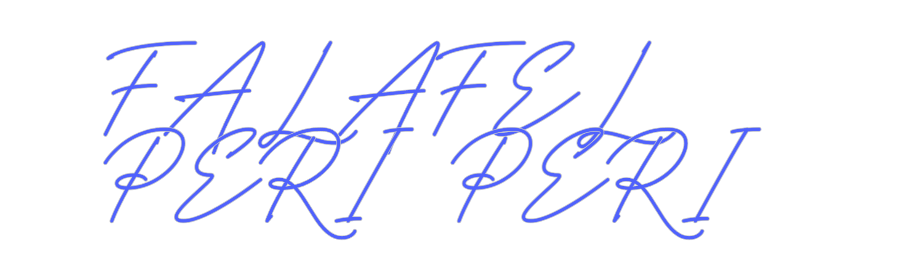 Text: FALAFEL PERI PERI Text Align: leftFont: RocketColour: BlueSize: 80cm wide / 80cm X 31.28cm / 31.5in X 12.32inBackboard: Cut to Letter (free upgrade)Jacket: Coloured JacketMounting: HangingAdd a Heart or Star (Optional): None (Default)Neon Tube Thickness: Bold Tube (8mm) (fre...