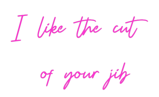 Original LogoText: I like the cut of your jib Text Align: CenterFont: SilvertoneColor: PinkSize: 120cm wide / 120cm X 60.01cm / 47.24in X 23.63inMaterial: Outdoor (+30%) Backboard: Cut to ShapeBackboard Color: Clear Acrylic BackboardJacket: Coloured JacketMounting: HangingAdd a Heart or S...