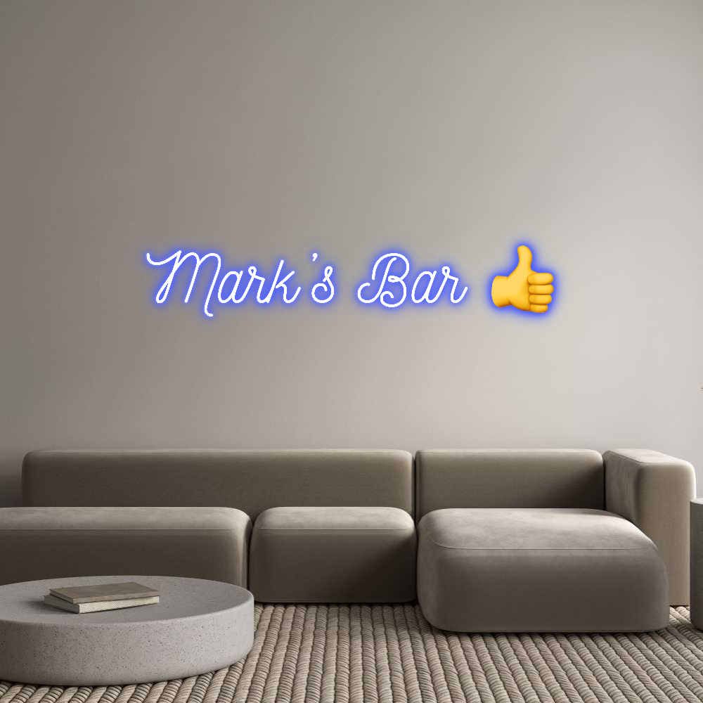 Text: Mark’s Bar 👍 Text Align: leftFont: NickainleyColour: BlueSize: 80cm wide / 80cm X 14.31cm / 31.5in X 5.63inBackboard: Cut to Letter (free upgrade)Jacket: Coloured JacketMounting: Wall mounting screwsAdd a Heart or Star (Optional): None (Default)Neon Tube Thickness: Bold Tube (8...