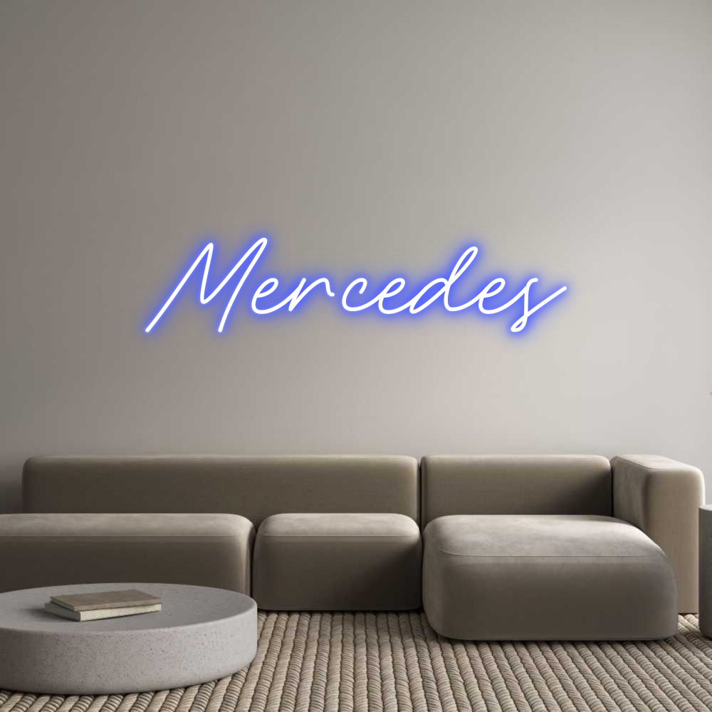Text: Mercedes Text Align: LeftFont: RocketColor: BlueSize: 140cm wide / 140cm X 32.67cm / 55.12in X 12.86inBackboard: Whole Board (free upgrade)Backboard Color: Silver MirrorJacket: Coloured JacketMounting: HangingAdd a Heart or Star (Optional): None (Default)Neon Tube Thickness: Cl...