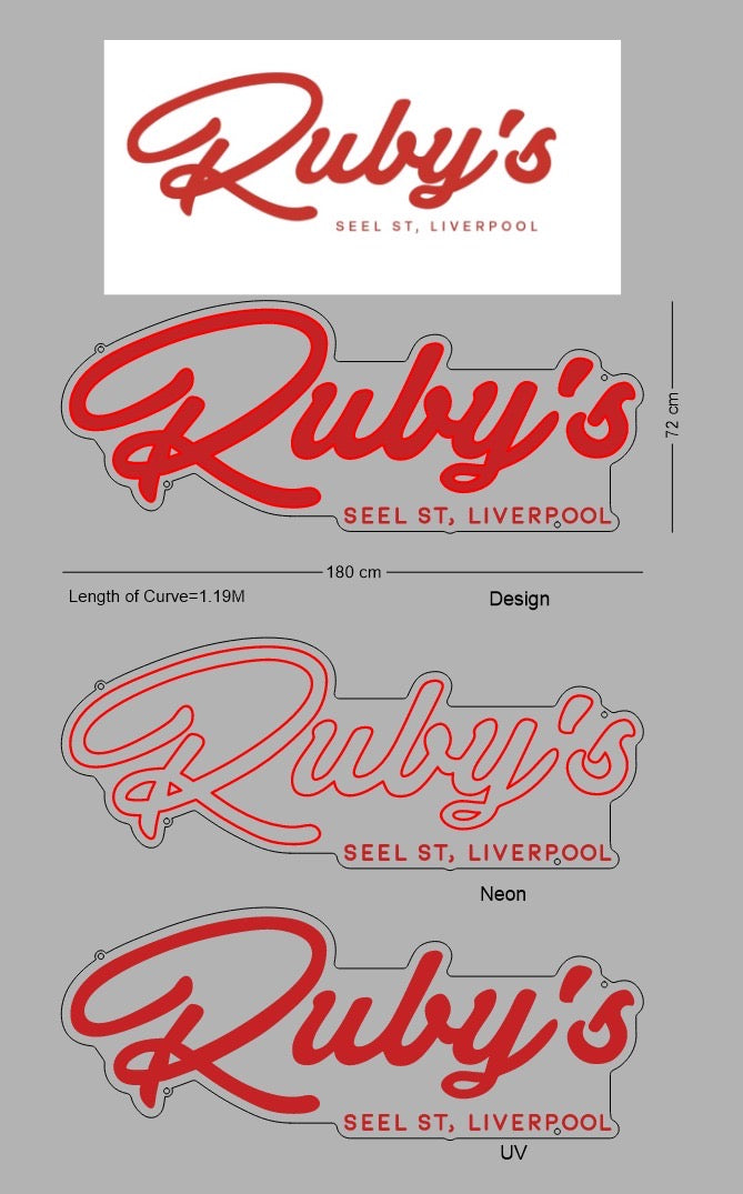 Text: Ruby Macintosh Text Align: CenterFont: RocketColor: RedSize: 200cm wide / 200cm X 30.05cm / 78.74in X 11.83inMaterial: IndoorBackboard: Cut to ShapeBackboard Color: Gold MirrorJacket: Coloured JacketMounting: Wall mounting screwsAdd a Heart or Star (Optional): None (Default)Neon Tube ...
