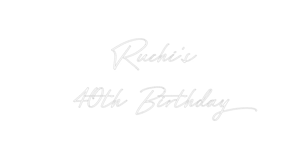 Text: Ruchi’s 40th Birthday Text Align: center Font: BayshoreColour: WhiteSize: 80cm wide / 80cm X 36.82cm / 31.5in X 14.5inBackboard: Cut to Letter (free upgrade)Jacket: White JacketMounting: Wall mounting screwsAdd a Heart or Star (Optional): None (Default)Neon Tube Thickness: Bo...