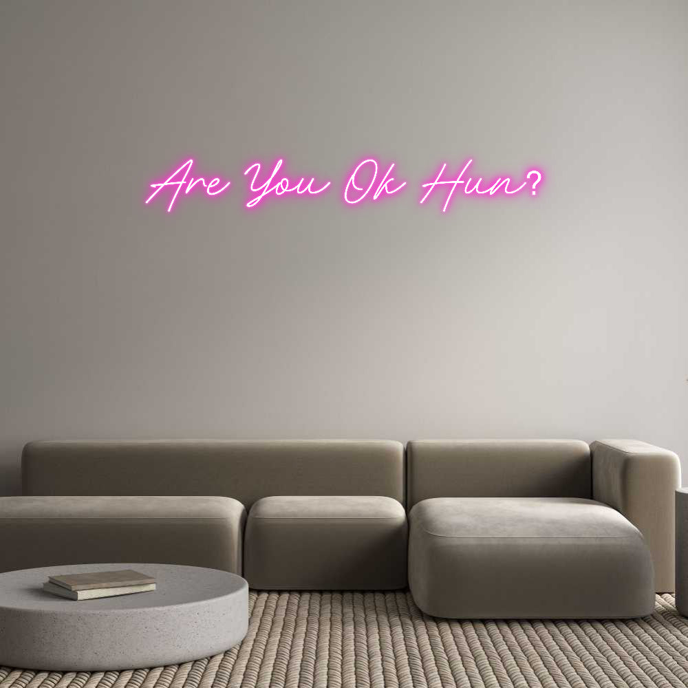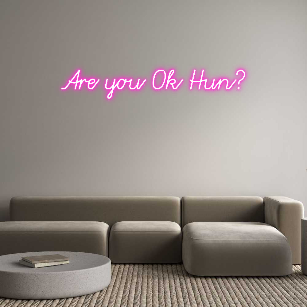 Text: Are you Ok Hun? Text Align: left Font: GruenewaldColour: PinkSize: 100cm wide / 100cm X 16.48cm / 39.37in X 6.49inBackboard: Cut to Letter (free upgrade)Jacket: Coloured JacketMounting: Wall mounting screwsAdd a Heart or Star (Optional): None (Default)Neon Tube Thickness:...