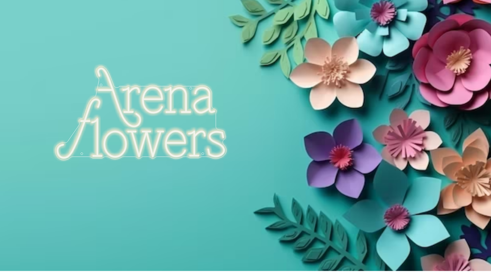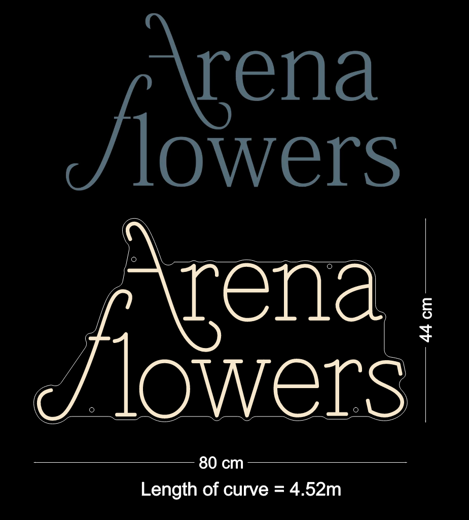 Text: Arena Flowers Text Align: center Font: RocketColour: BlueSize: 60cm wide / 60cm X 41.16cm / 23.62in X 16.2inBackboard: Cut to Letter (free upgrade)Jacket: Coloured JacketMounting: Wall mounting screwsAdd a Heart or Star (Optional): None (Default)Neon Tube Thickness: Bold Tube ...