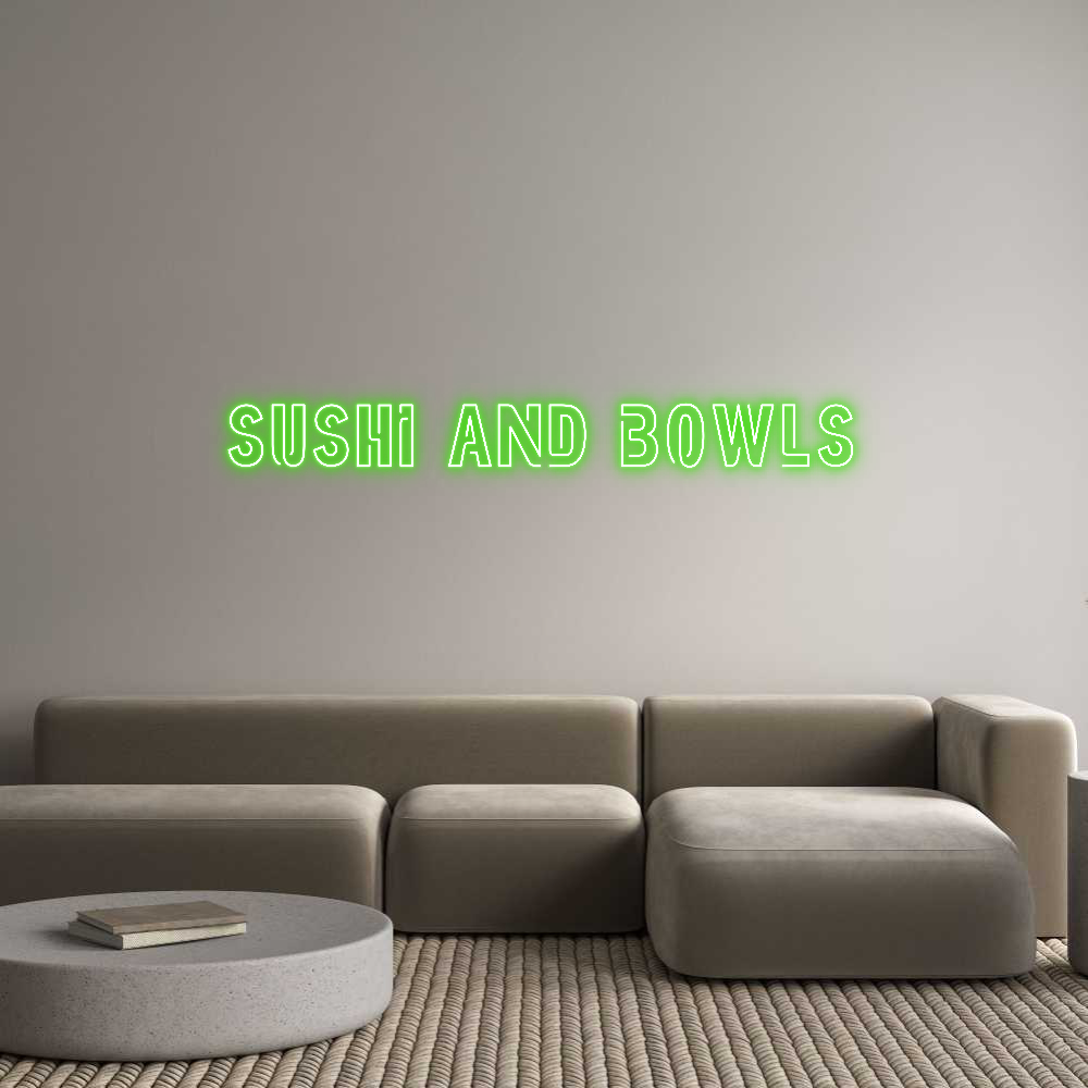 Text: Sushi and Bowls Text Align: leftFont: NeonColour: GreenSize: 100cm wide / 100cm X 11.06cm / 39.37in X 4.36inBackboard: Whole Board (free upgrade)Backboard Colour: BlackJacket: Coloured JacketMounting: HangingAdd a Heart or Star (Optional): None (Default)Neon Tube Thickness: Bol...