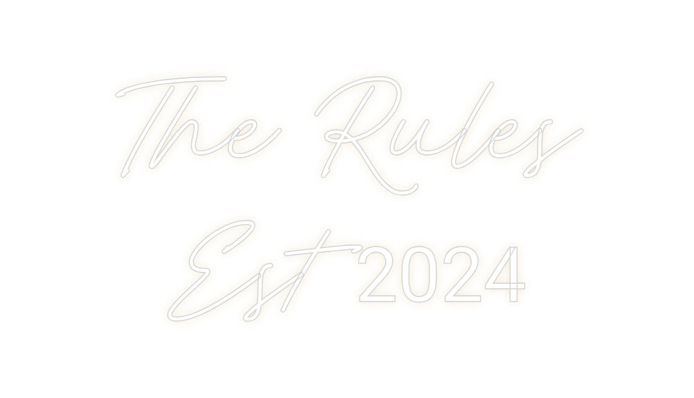 Text: The Rules Est 2024 Text Align: center Font: RocketColour: Warm WhiteSize: 80cm wide / 80cm X 41.1cm / 31.5in X 16.18inBackboard: Cut to ShapeBackboard Colour: Clear Acrylic BackboardJacket: Coloured JacketMounting: HangingAdd a Heart or Star (Optional): None (Default)Neo...